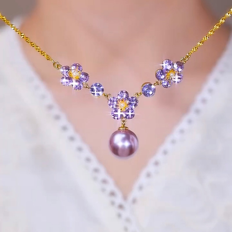 紫色鋯石花朵珍珠項鍊