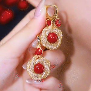 新款紅珍珠網紗花朵耳環