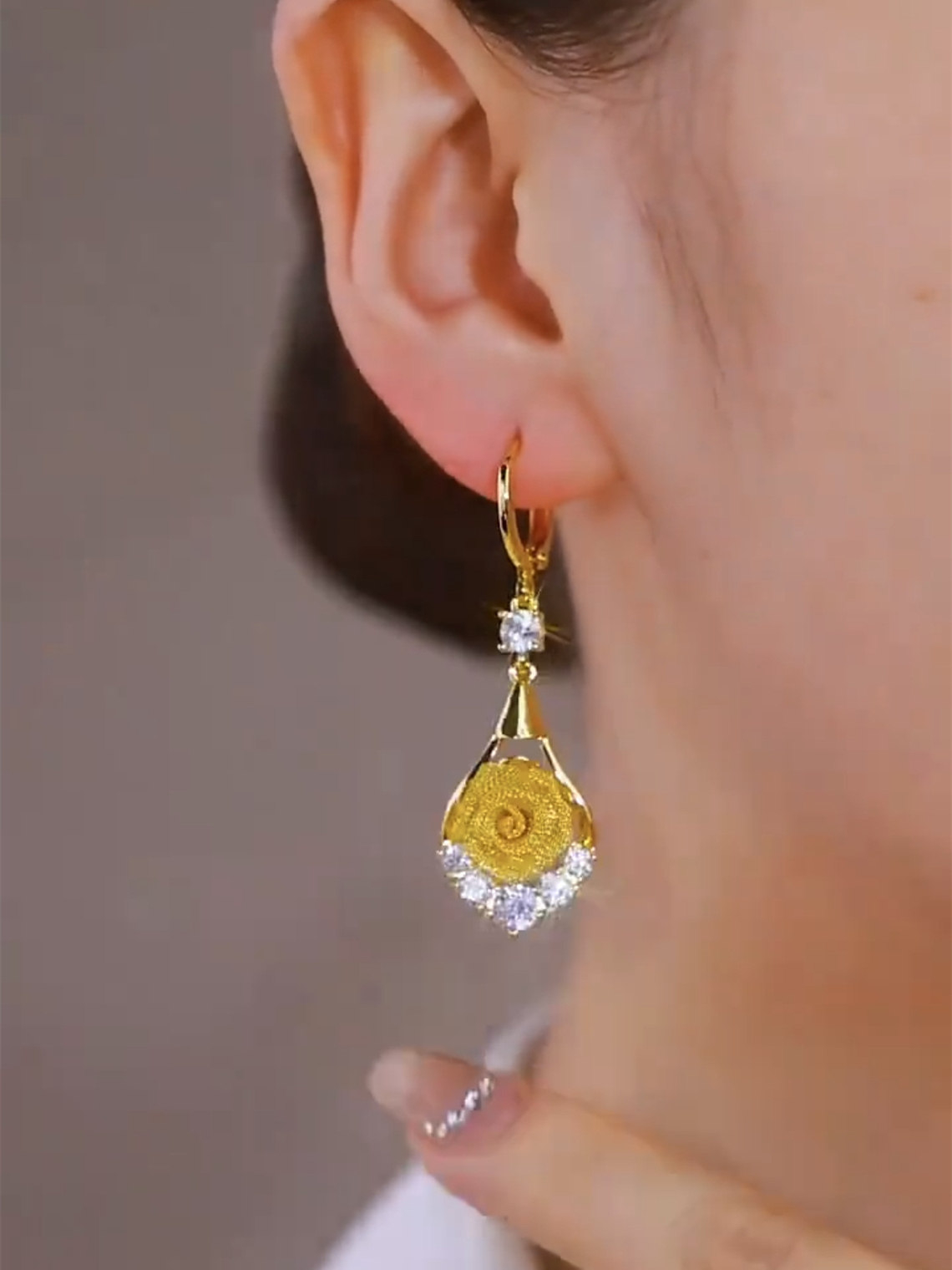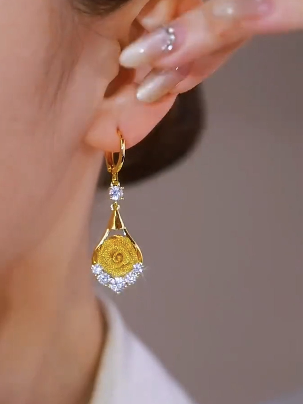金色鑲鑽網紗玫瑰花耳環