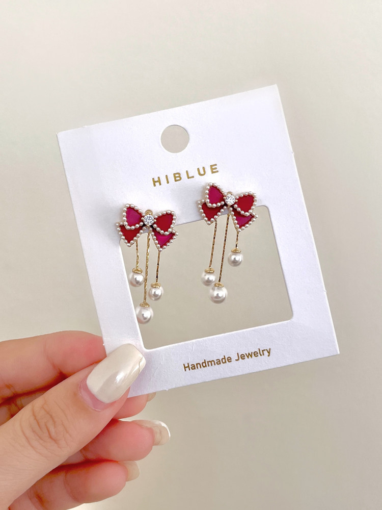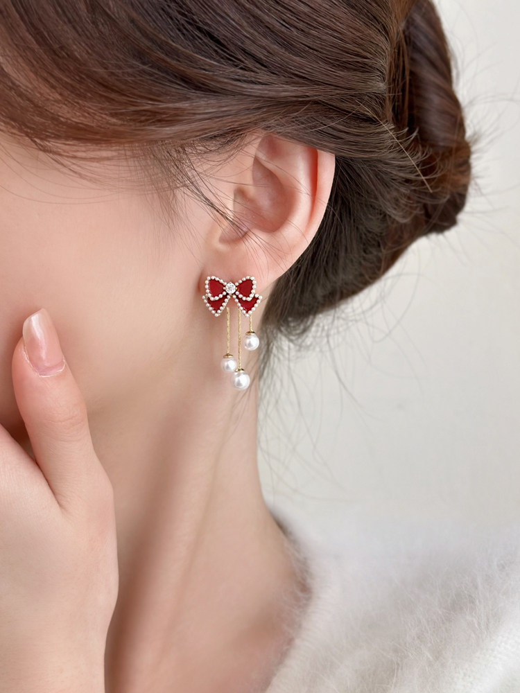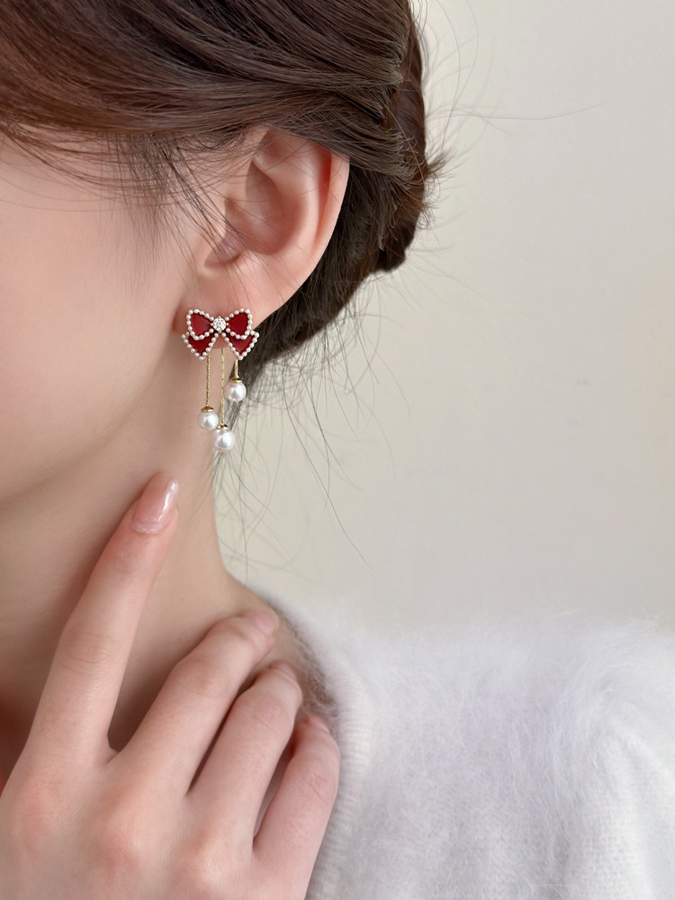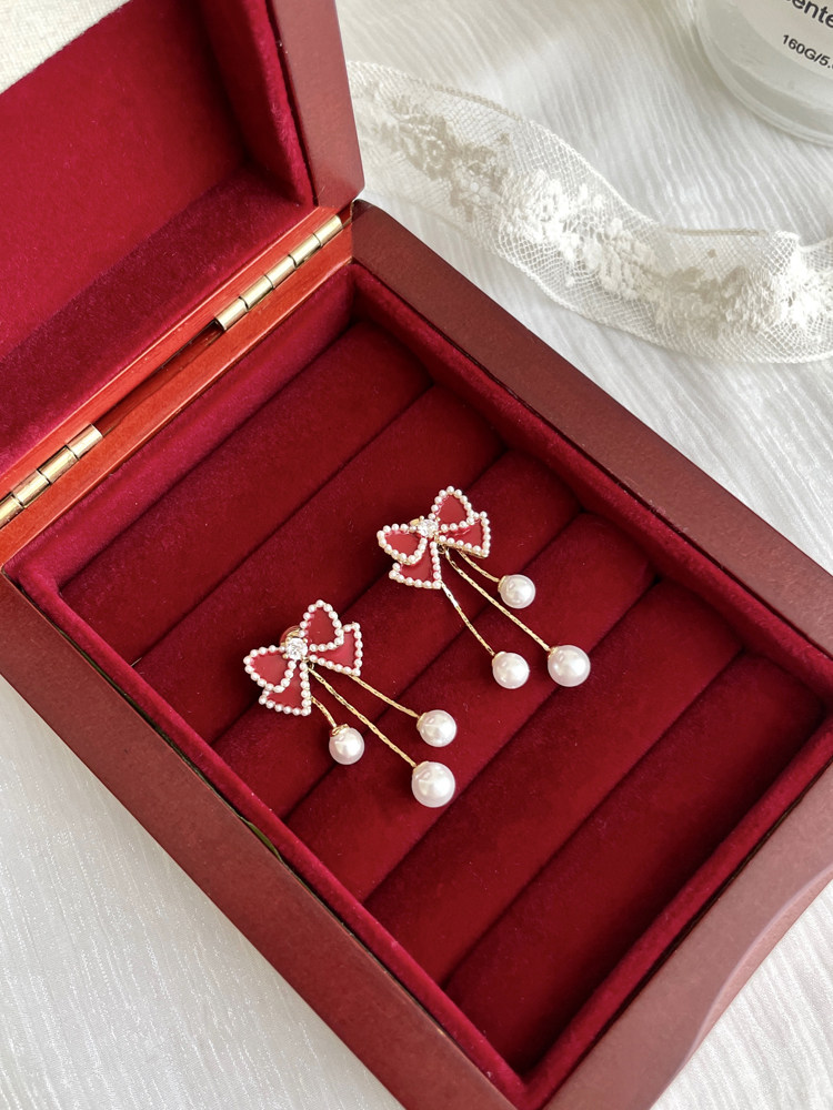 紅色蝴蝶結珍珠流蘇耳環