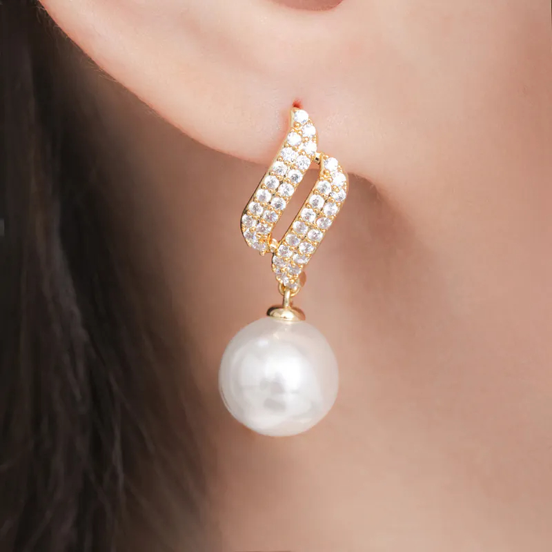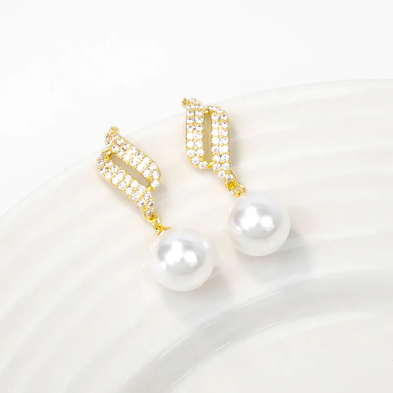 「耳畔樂章」雙排滿鑽弧形曲線珍珠耳環